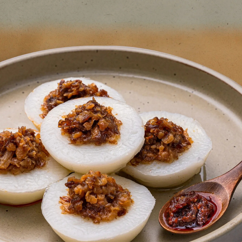 The highlight of our Chwee Kueh is the generous topping of Chai Poh (savoury preserved radish), slow-simmered for hours with garlic and shallots to achieve a deep, umami-rich fragrance. Finished with a dollop of our signature dried-shrimp sambal chili, it delivers a perfect harmony of sweet, salty, and spicy notes.